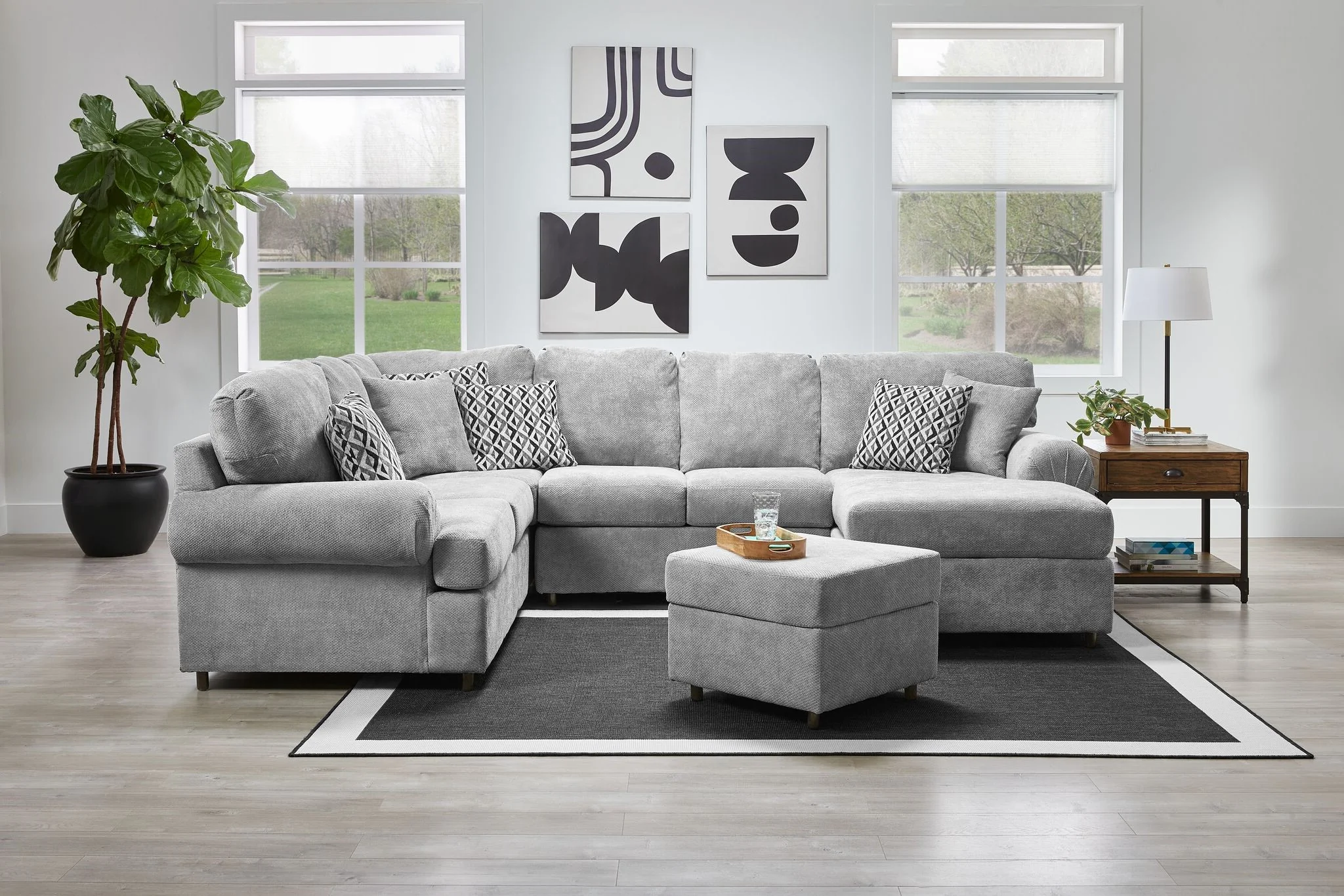 Coveted Comfort. The Jupiter sectional offers you ample space to spread out or seat a group, along with comfy, easy-care fabric in a cool neutral colour to complete your relaxation. Boasting three seating sections, including a generous chaise, this sectional's pleated roll arms, loose back cushions and slightly textured, ultra-soft upholstery will match with most décor and reflect chic urban style. The comfort of you and your guests will be ensured when you find a spot for the Jupiter in your living room. Made in Canada. Four-piece sectional includes left-facing loveseat, wedge, armless unit and right-facing chaise, as shown.;;;;Jupiter Sectionnel 4 mcx avec fauteuil allongé à droite - gris cendré;;;;Bien-être convoité. Le sectionnel de la collection Jupiter vous offre beaucoup d’espace pour vous allonger ou pour asseoir un groupe, avec son tissu confortable, facile d’entretien, dans une rafraîchissante couleur neutre pour compléter votre détente. Avec trois sections d’assise, incluant un généreux fauteuil allongé, ce sectionnel est doté de bras plissés arrondis, de coussins de dos amovibles et d’un revêtement très doux, légèrement texturé, qui conviendra à la plupart des décors et reflètera un chic style urbain. Votre confort et celui de vos invités sera assuré lorsque vous trouverez l’endroit parfait pour le Jupiter dans votre salle de séjour. Fabriqué au Canada. Le sectionnel de quatre morceaux comprend la causeuse côté gauche, le coin, la causeuse sans bras et le fauteuil allongé côté droit, tel que montré.