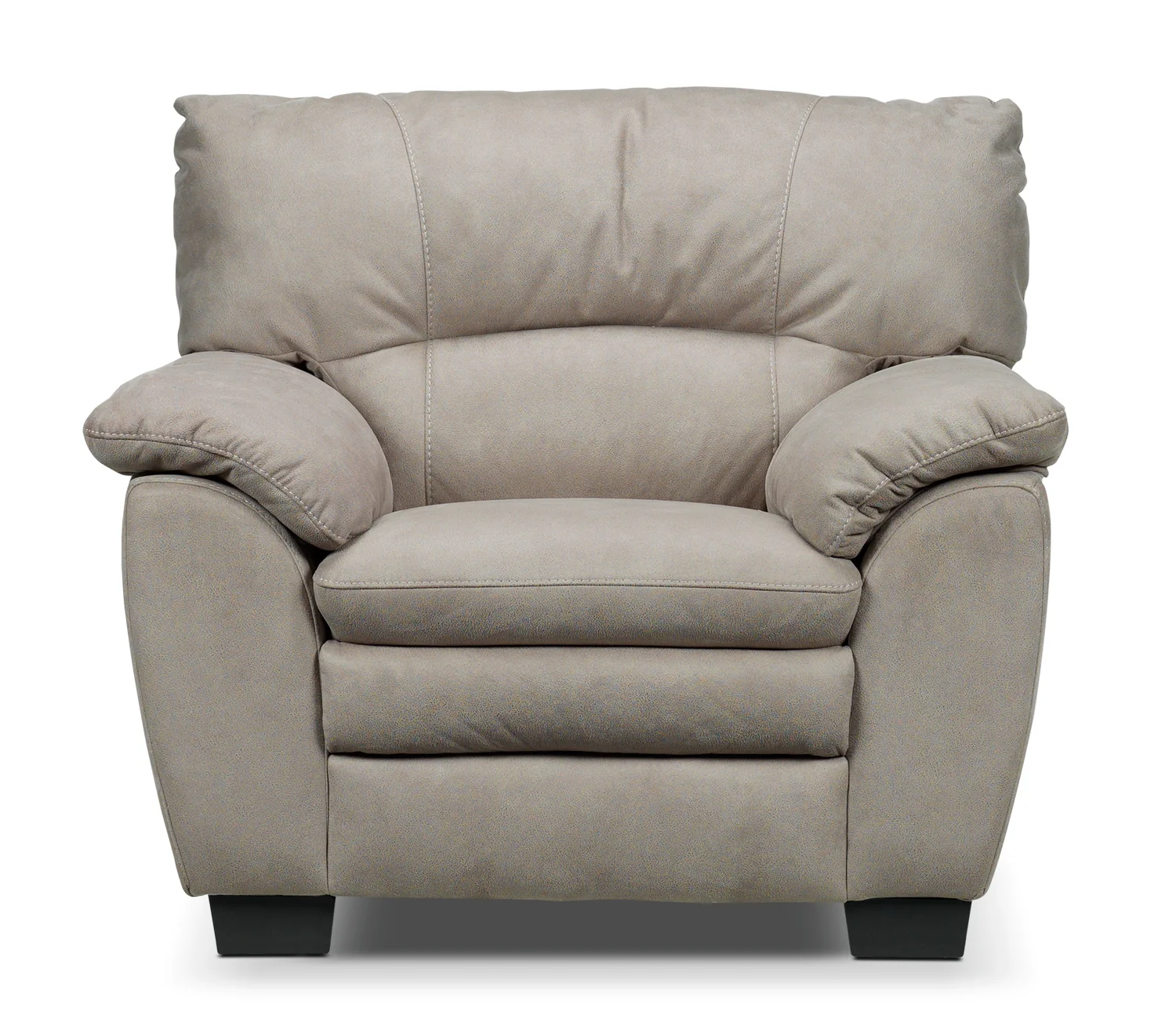 Stacked Deck. The Kelleher beige chair has style and comfort in the cards with its plush cushioning and fabric as well as designer stitching. A channel-tufted back cushion, pillowtop arms and a stacked base supporting a comfy seat outfit the Kelleher Beige with aces all around. Tone-on-tone baseball stitching along with welted trim offers a strong, chic aesthetic. With all the support and good looks, you'll be flush with pride over your living room furniture.;;;;Kelleher Fauteuil - gris argent;;;;Base superposée. Le fauteuil de la collection Kelleher - gris argent possède style et confort avec son rembourrage et son tissu moelleux ainsi que ses coutures de designer. Un coussin de dos à canaux rembourrés, des bras à plateau-coussin et une base superposée soutiennent confortablement les assises de ce fauteuil. Les coutures baseball ton sur ton tout autour avec une bordure passepoil offrent une esthétique robuste et chic. Avec tout le support et l’élégance, vous déborderez de fierté pour votre mobilier de salle de séjour.