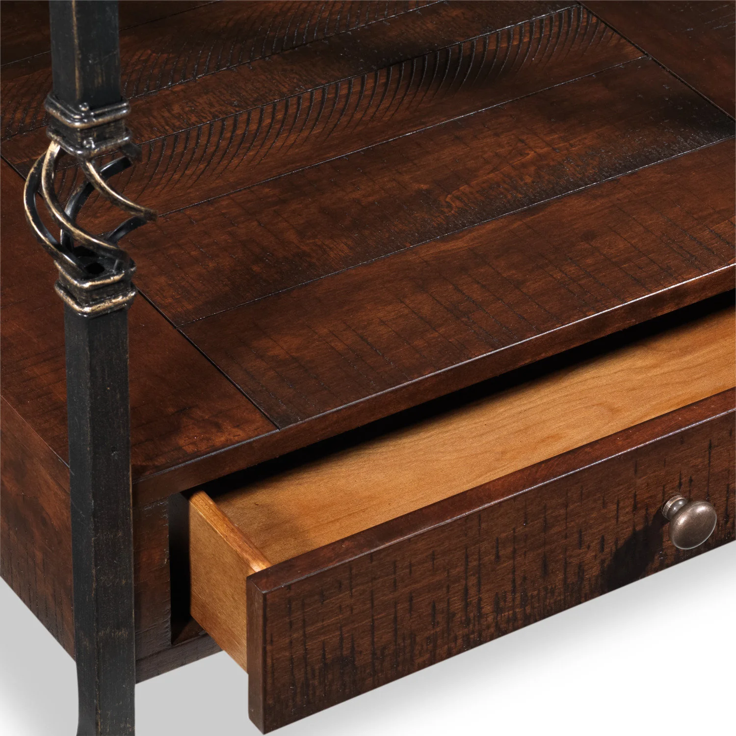 Classic Catch. The Sterling end table brings sophisticated style to your living room with its timeless design elements. Planked birch wood construction features a rich walnut finish that adds warmth and traditional flair to your setup. A strip of dark metal nailhead trim lines the perimeter of the tabletop, while ornate metal embellishments adorn the table legs to make an elegant statement. A convenient drawer finishes the design with space for your magazines, remotes and other entertainment essentials. Customer assembly required.;;;;Sterling Table de bout 26 po – noyer;;;;Classique acquisition. La table de bout de la collection Sterling apporte un style sophistiqué à votre salle de séjour avec ses éléments de design intemporel. La construction en planches de merisier est dotée d’un riche fini noyer qui ajoute un style chaleureux et traditionnel à votre aménagement. Une bande de bordure de clous à griffes en métal foncé double le périmètre du dessus de table, tandis que des décorations métalliques travaillées ornent les pattes de table pour en faire un énoncé élégant. Un pratique tiroir complète le design avec de l’espace pour vos revues, télécommandes et autres accessoires de divertissement. Assemblage requis par le client.
